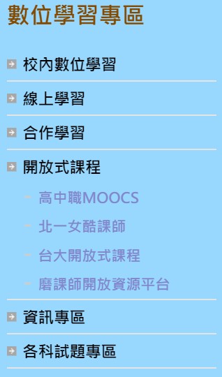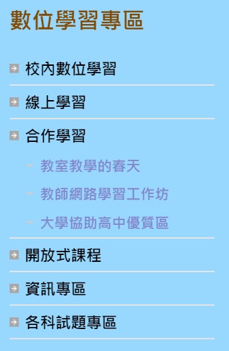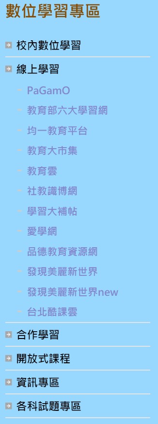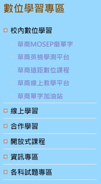 全校的數位學習專區,內容蒐集非常豐富,項目有以下所列這麼多,歡迎連結至學校首頁左下方目錄區使用…