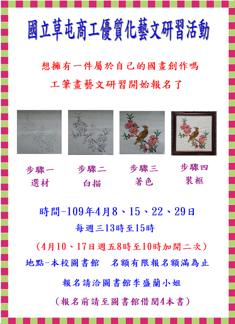 本校108學年度第二學期藝文研習成果 研習主題:國畫工筆畫作 時間:109年4月8,15,22,25...